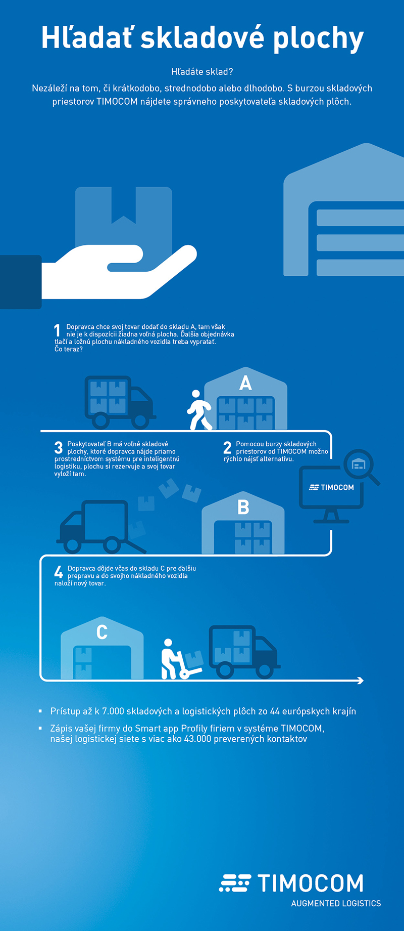 Máte sklad a chcete ho optimálne vyťažiť? Alebo hľadáte vhodnú skladovú plochu? Potom pre vás máme riešenie: V našom TIMOCOM Marketplace ponúkame aj burzu skladových priestorov. Ide o najväčšiu B2B sieť skladových plôch rôznych typov a veľkostí v Európe – bez ďalších nákladov. Ako používateľ Marketplace máte automaticky prístup k viac ako 9.000 poskytovateľom skladových a logistických plôch v 46 európskych krajinách. Podľa potreby môžete vyhľadávať alebo uverejňovať ponuky a priamo kontaktovať potenciálnych obchodných partnerov.